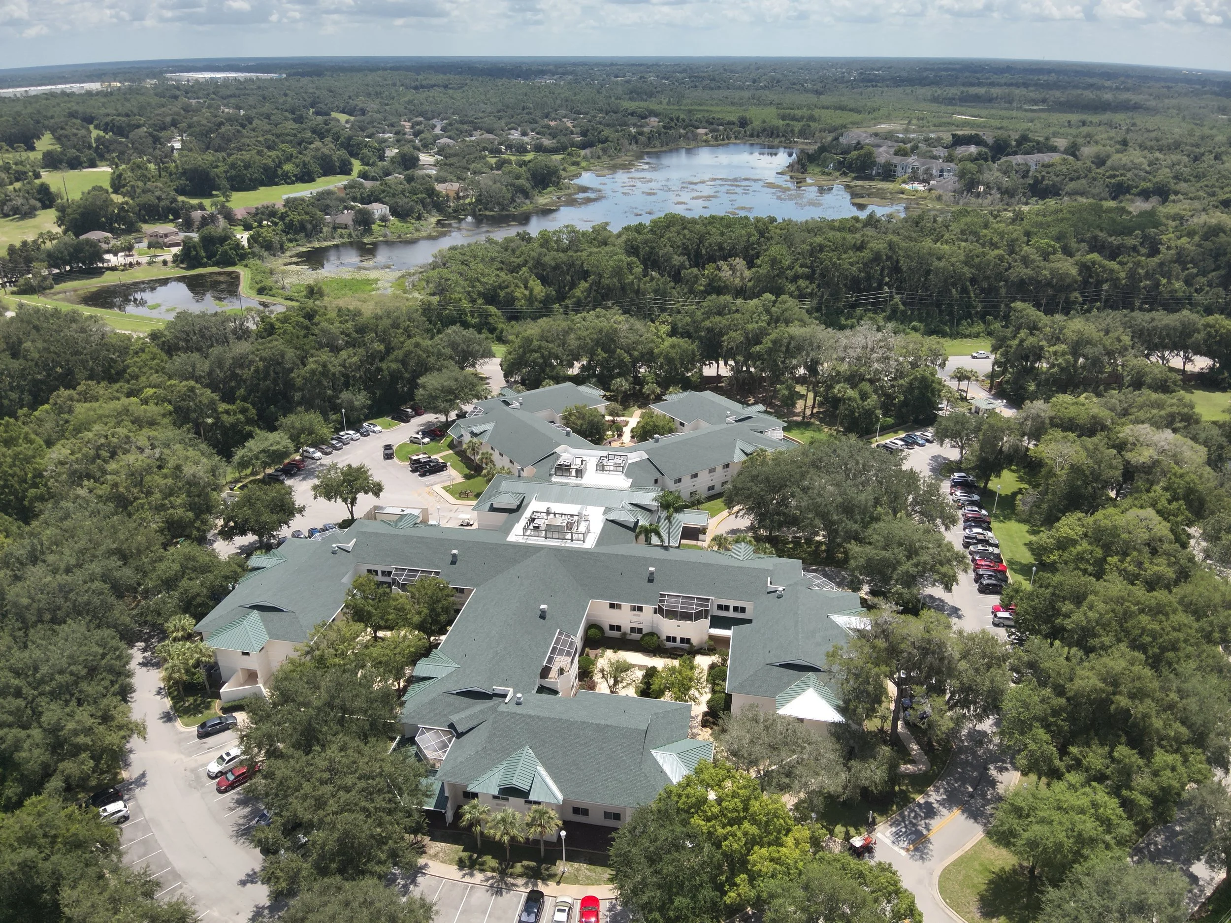 The Majestic Oak rehabilitation hospital underwent a comprehensive roofing project that involved the full replacement of various roofing systems including shingle, metal, and TPO.